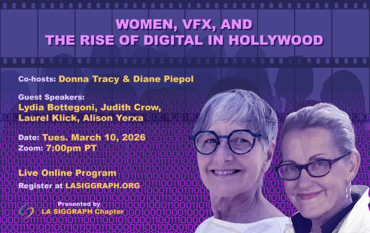 The origin stories and trajectories of women in VFX will be highlighted in this panel co-hosted by Donna Tracy and Diane Piepol. It will be presented in conversation with Lydia Bottegoni, Judith Crow, Laurel Klick, and Alison Yerxa. We will investigate the when, where, and how these women gained entry into the rarified world of VFX, where those paths led, along with their experience of the titanic transition of Hollywood to digital media and tools. We will also consider parallels to the current revolution underway in media production.